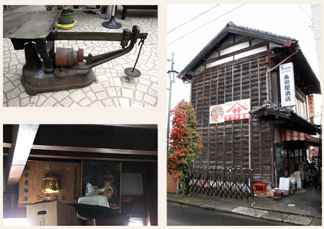 木地元の木材を使い、梁も厚く壁の厚みもあり、西日が当たっても室内が暑くならないそうです。(画像右)店舗内に分銅式の古い量りがあり(画像左上)かつてはこれで醤油や味噌も量り売りしていました。昭和30年代までは近郷の農家から委託を受け、ナタネ、ゴマの油も絞って売っていたそうです。