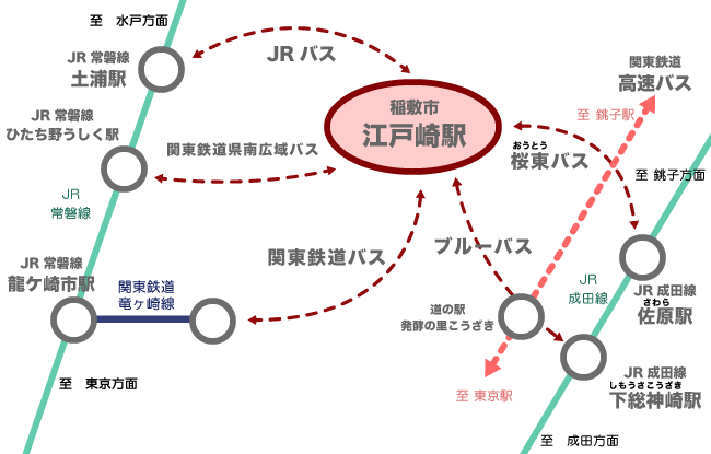 稲敷市内には、鉄道駅がありませんが、東京からの高速バス、また、土浦・龍ヶ崎(常磐線等)や佐原(成田線)から、路線バスを利用して稲敷市にアクセスすることができます。