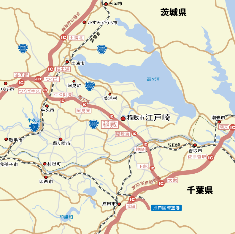 稲敷市内には圏央道「稲敷インターチェンジ」、「稲敷東インターチェンジ」と2箇所のインターチェンジがあります。常磐道、および東関東道経由で首都圏から約1時間40分程度の距離です。