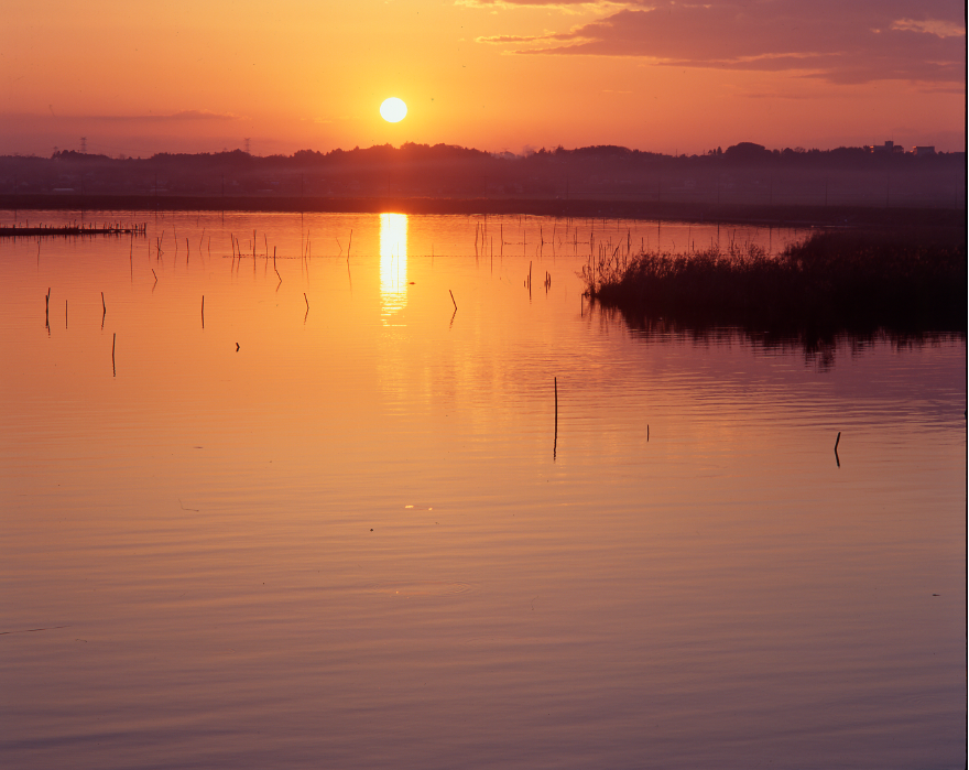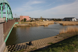 江戸崎、門前と稲波の境、水面越しにまちなかを望むかつての岬の突端、洲崎(すざき)。