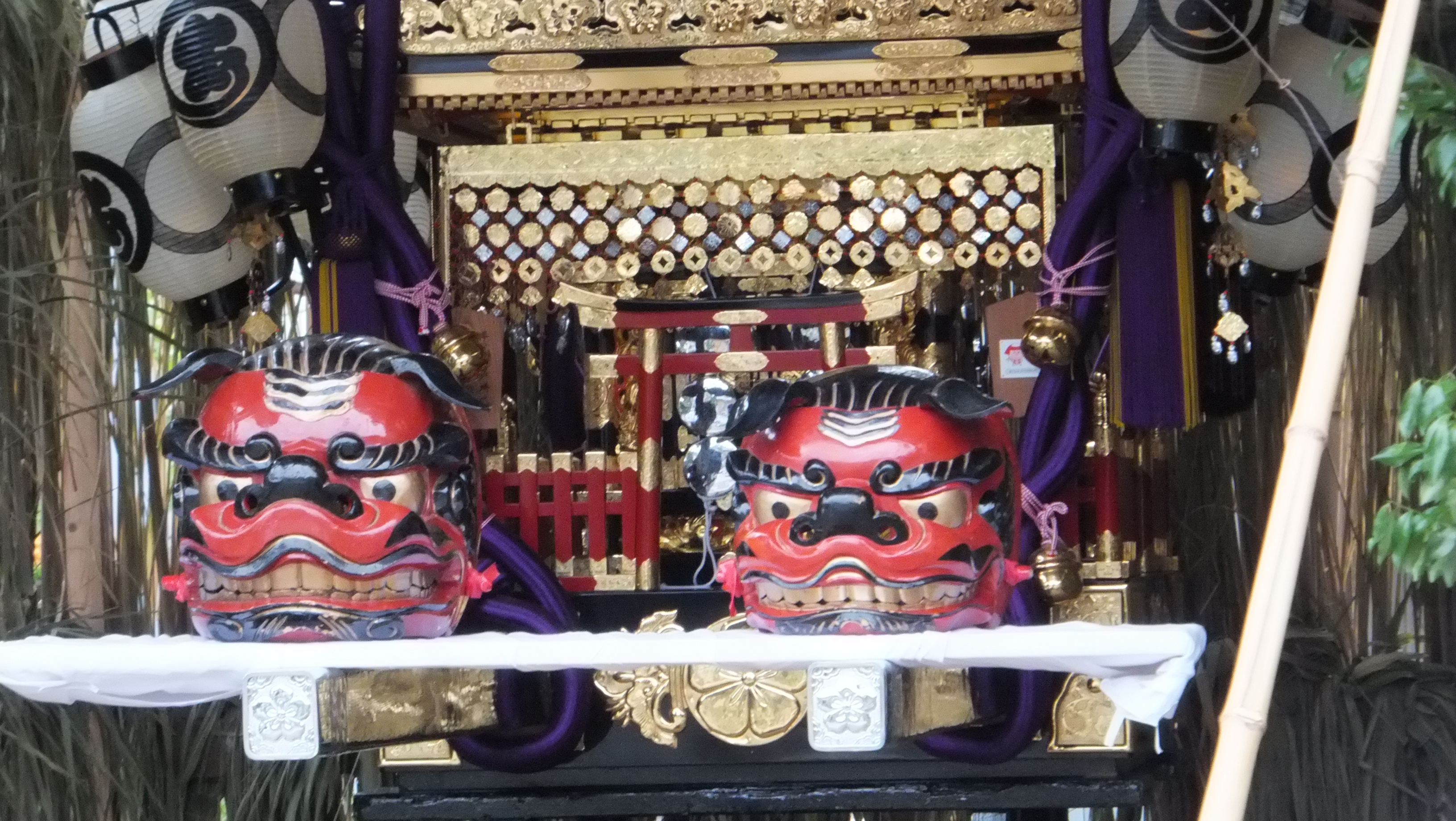| 御仮屋に鎮座する神輿(門前町) | 露払いの儀(獅子)用の獅子頭(荒宿町) |