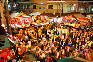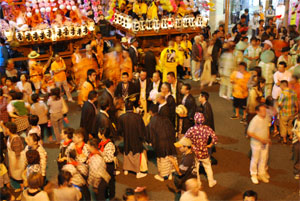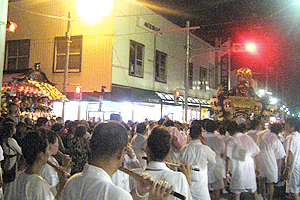 そして各町内ごとに順番に「ぶん回し」を行います。ひと通り演奏が終わると各町内の世話人が中央に集まり、申し合わせをし手打ちをしてそれぞれの町内の山車に戻り、 同じ曲を一斉に演奏する「叩き別れ」をして散会します。
