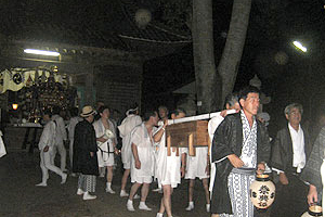 神輿が鹿島神社に到着すると、神官による祝詞奏上があり、すべての明かりが消され、白布マスクをした神官によって、御神体が本殿に納められます。