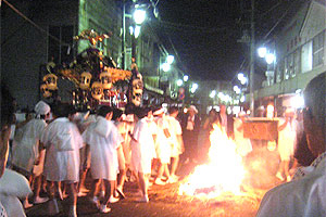 なお、鹿島神社でも同じような要領で、御神体が神輿に移され、御神酒奉盃の儀が行われ、休憩後出発します。やがて、神輿がお仮屋に近づくと、焚上げといってお仮屋の前に高く積まれた藁に点火されます。