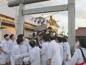 さらに、これが終わると、祭典係2人が交互に神酒を酌み交わし、最後に神官へ同じ要領で神酒を差し上げます。そしてすべてが終了すると、天王町役員の先導で御輿が出発します。