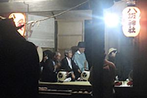 御神酒奉盃の儀後、当番町祭典が、神官の前に三つの盃を乗せた三宝を置き御神酒を注ぎ、盃をを飲み干します。終わると神官のあいさつがあり、手締めをして3日間に渡る祭礼は、めでたく千秋楽となります。![]() |