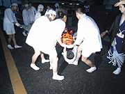 鳥居を潜る神輿(本宿町) | 八坂神社を出発する神輿(浜町) |