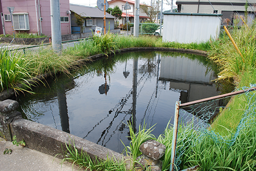 【画像上】本堂の入り口正面には「ひょうたん池」があり、江戸崎城の外堀の名残といわれています。ひょうたん池には、天保14年(1843年)に江戸崎出身の江戸商人(浅草花川戸の醤油酢問屋)、伊勢屋宇兵衛(いせやうへい)が架けた石橋が残されています。
