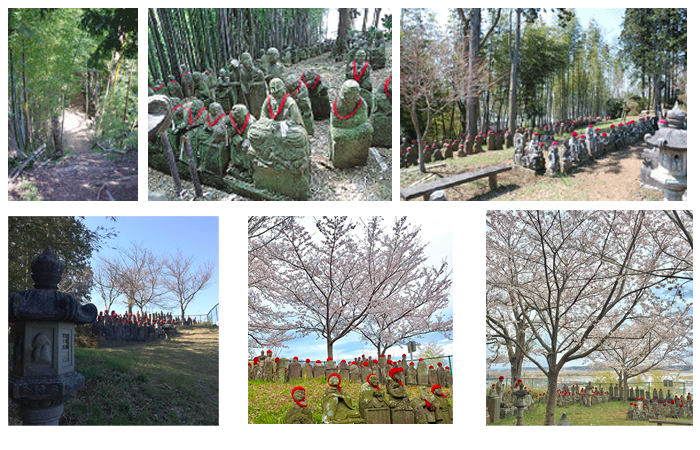 瑞祥院の本堂を裏手にまわり、うっそうとした竹林の石段を登り山頂に着くと、目の前に忽然と現れる石像群が「五百羅漢(ごひゃくらかん)」です。石像群の中央に眺望のよい「金毘羅神社(こんぴらじんじゃ)」があります。ここからは、江戸崎のまちなかがほぼ見渡す事ができます。
