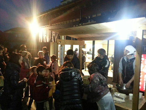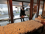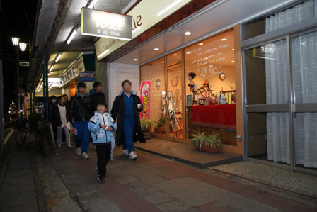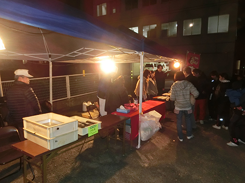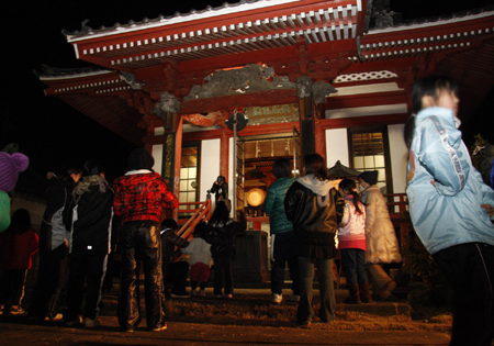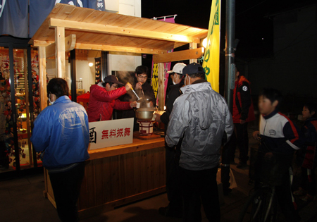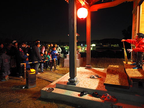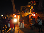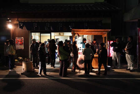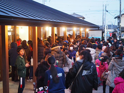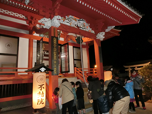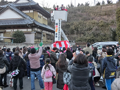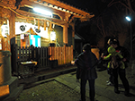 「えどさきまちなか豆まき巡り」ギャラリーです。 例年まちなかではライトアップや各種イベントを行い、たくさんの参拝客で賑わいます。 ※画像をクリックすると拡大されます。 笑遊館にて「福豆」準備中。 オリジナルの開運升です。 「福餅まき」大賑わい! 「福豆」を持って豆まき巡りがスタートします。 東郷菓子舗では「水ようかん」が人気です。 温かい甘酒が人気です。 「江戸崎囃子連」のお囃子。 「雅会囃子連」のお囃子。 青木菓子店前では「おしるこ」の振る舞い。 お店の中も大盛況です。 鹿島神社の境内。 「福は内!」の声が響きます。 金比羅堂の入り口。さて頂上には何がいるのか? 赤鬼が待ち構えています!子供達は大喜び! 根宿町の皆さんの「豚汁」の振る舞い。 商店街では「雛飾り」も。 不動院参道入り口では恵方巻きを売っていますよ! 不動院仁王門。ライトアップされています。 山の上の不動院本堂。ここで最後の豆まき。 無病息災をお祈りします。