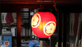 【右:江戸崎祗園で町内各戸の軒先に飾られる提灯。土岐桔梗の紋が描かれる】