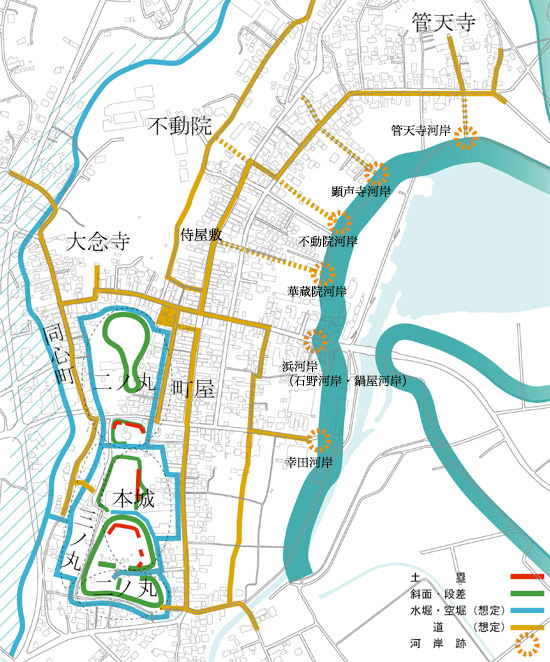 なお、「不動院河岸」「顕声寺河岸」「管天寺河岸」は、図からも分かるように、各々の寺からまっすぐに伸びる道の先にあったと考えられる。