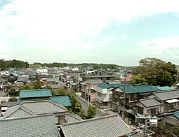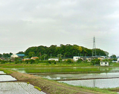 【画像右】大宿町方面から見渡した「城山」の全景。左の青い屋根は江戸崎小学校の体育館。