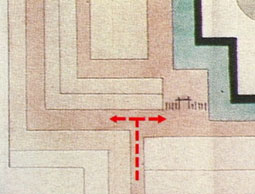 「古城図」に表されている戸張町の中央十字路付近。右に「門」が描いてある。北方向から本城への敵の侵入を左右に分散させるために「T字路」