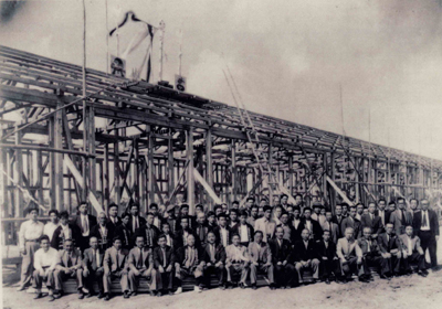 【右】昭和30年台の上棟式の様子。場所は不明ですが、建物の様子から江戸崎中学校の旧校舎の雰囲気です。
